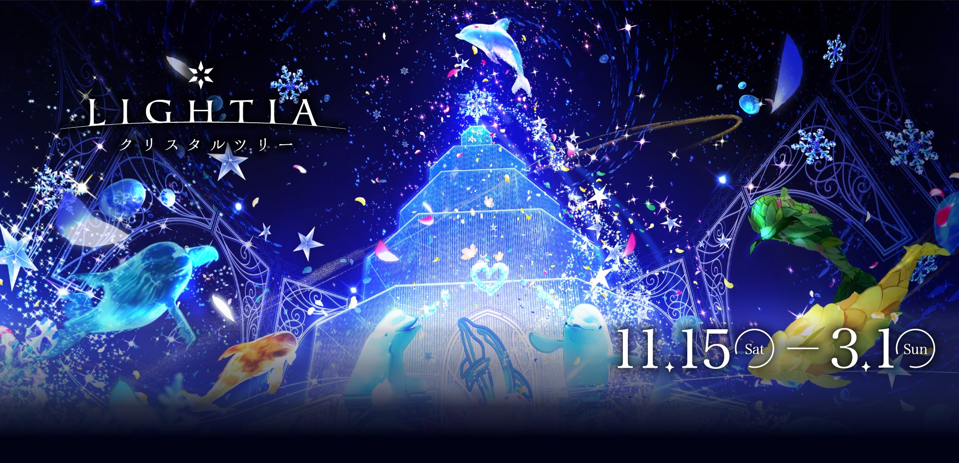 【11/15~3/1】イルカと映像・光・音・噴水の演出がシンクロした、没入型のナイトパフォーマンスを毎日開催!広場には「LIGHTIA」の物語に登場する“キセキの花”が咲く高さ約8mのクリスタルツリーが楽しめます!