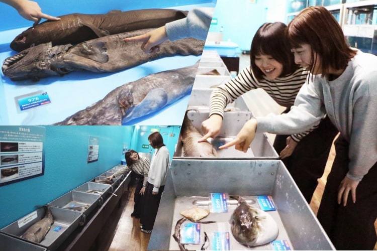 東京湾・相模湾の深海にすむ希少な生きものとともに、この海域で捕獲されたとても珍しい深海ザメ「ミツクリザメ」や「ラブカ」の標本を展示します。