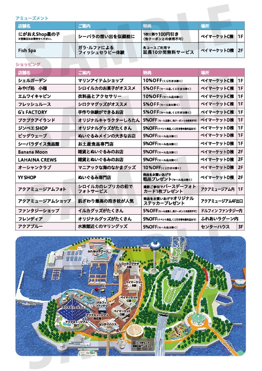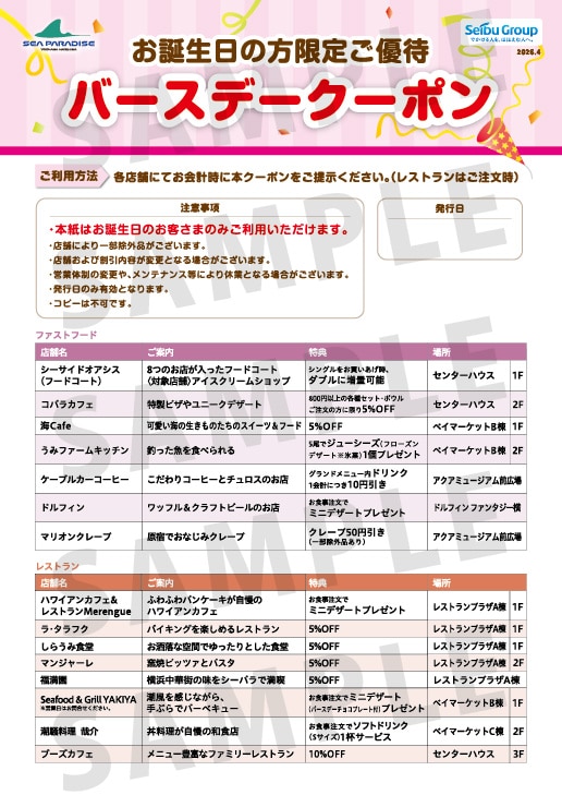 また、当日チケットを引換えの際に、島内各所で使えるお買いもの・お食事の割引券「バースデークーポン」をプレゼントいたします。