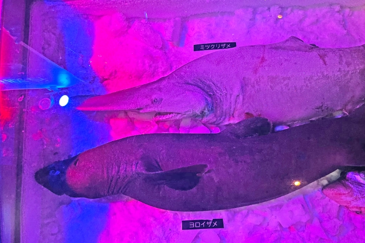 アクアミュージアではミツクリザメ、ラブカなど、生体展示が難しい貴重な深海ザメたちの冷凍標本を展示。一部にさわることができます!