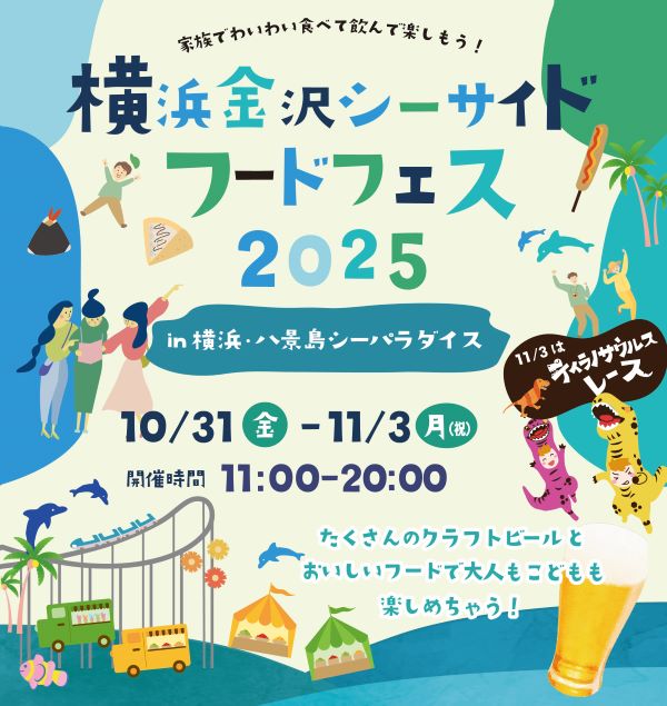 豊富なフードメニューとクラフトビールで、こどもから大人まで楽しめます。秋の海風を感じながらシーパラで“食欲の秋”を満喫しませんか?11/3限定で「ティラノサウルスレース」も開催!