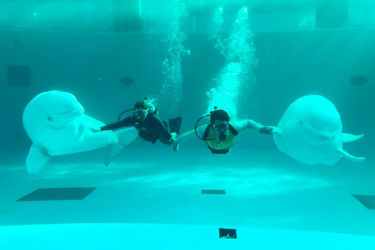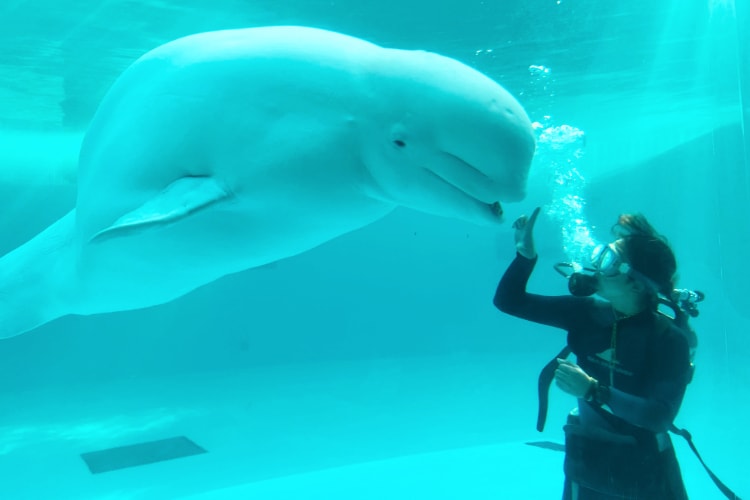 冬だけの期間限定 飼育員とシロイルカが水中で息を合わせてパフォーマンス