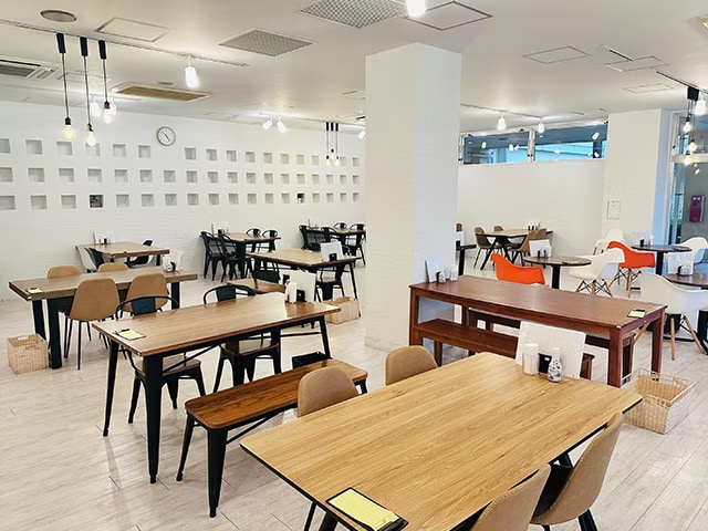 ガラス張りで明るくお洒落な店内はカフェタイムやデートにもぴったり。ヘルシーメニューからボリューム感ある定食、デザートのご用意もございます。