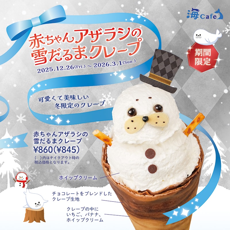 海Cafeでお馴染みの赤ちゃんアザラシクレープが、冬限定・雪だるまの姿になって登場!