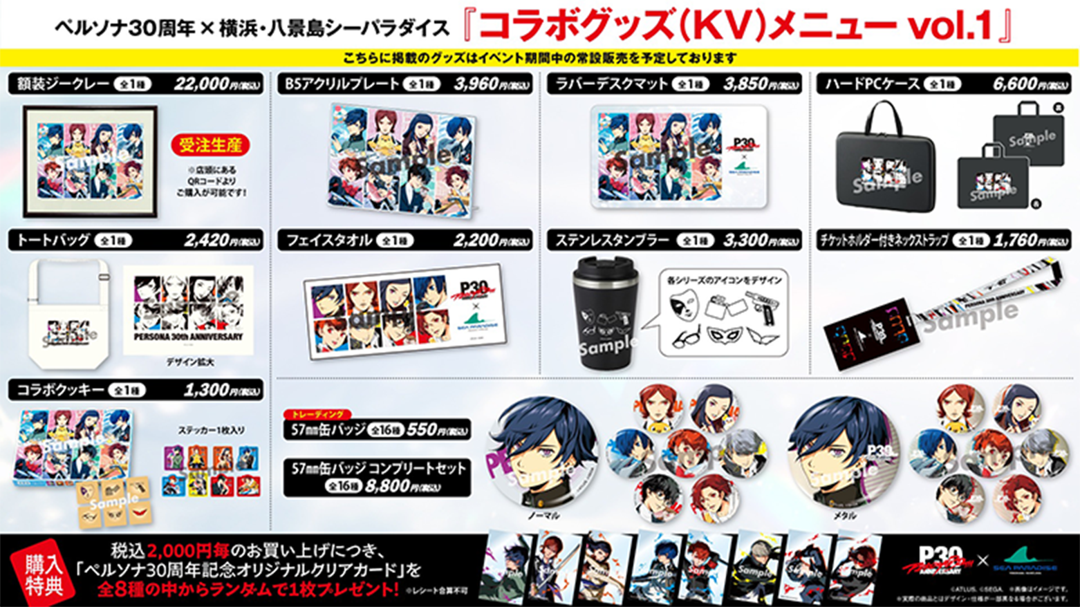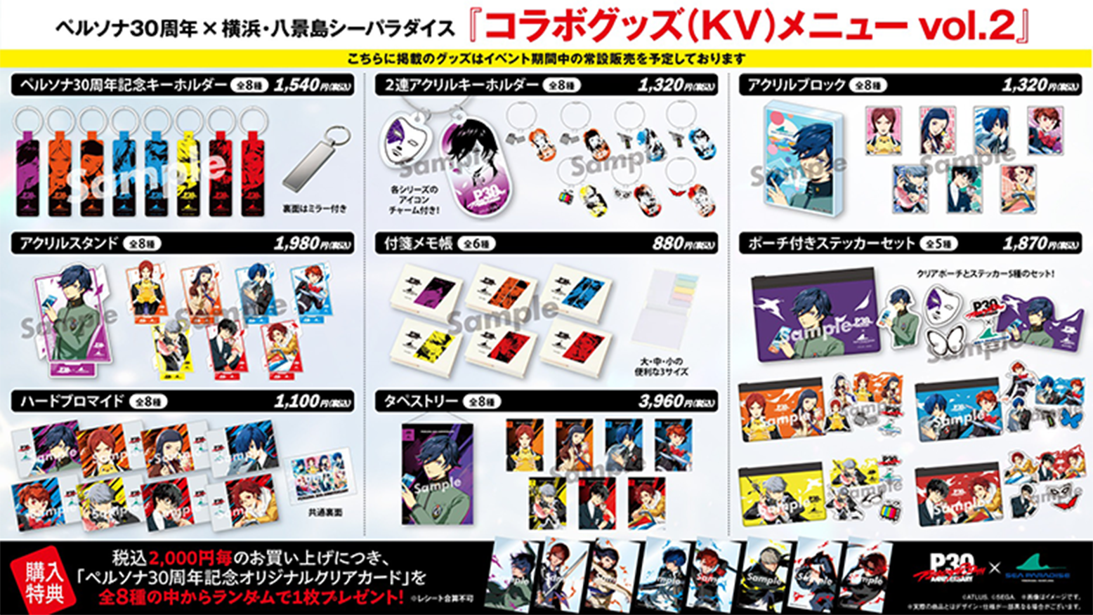 税込2,000円毎のお買い上げにつき、「ペルソナ30周年記念オリジナルクリアカード」を全8種の中からランダムで1枚プレゼント!