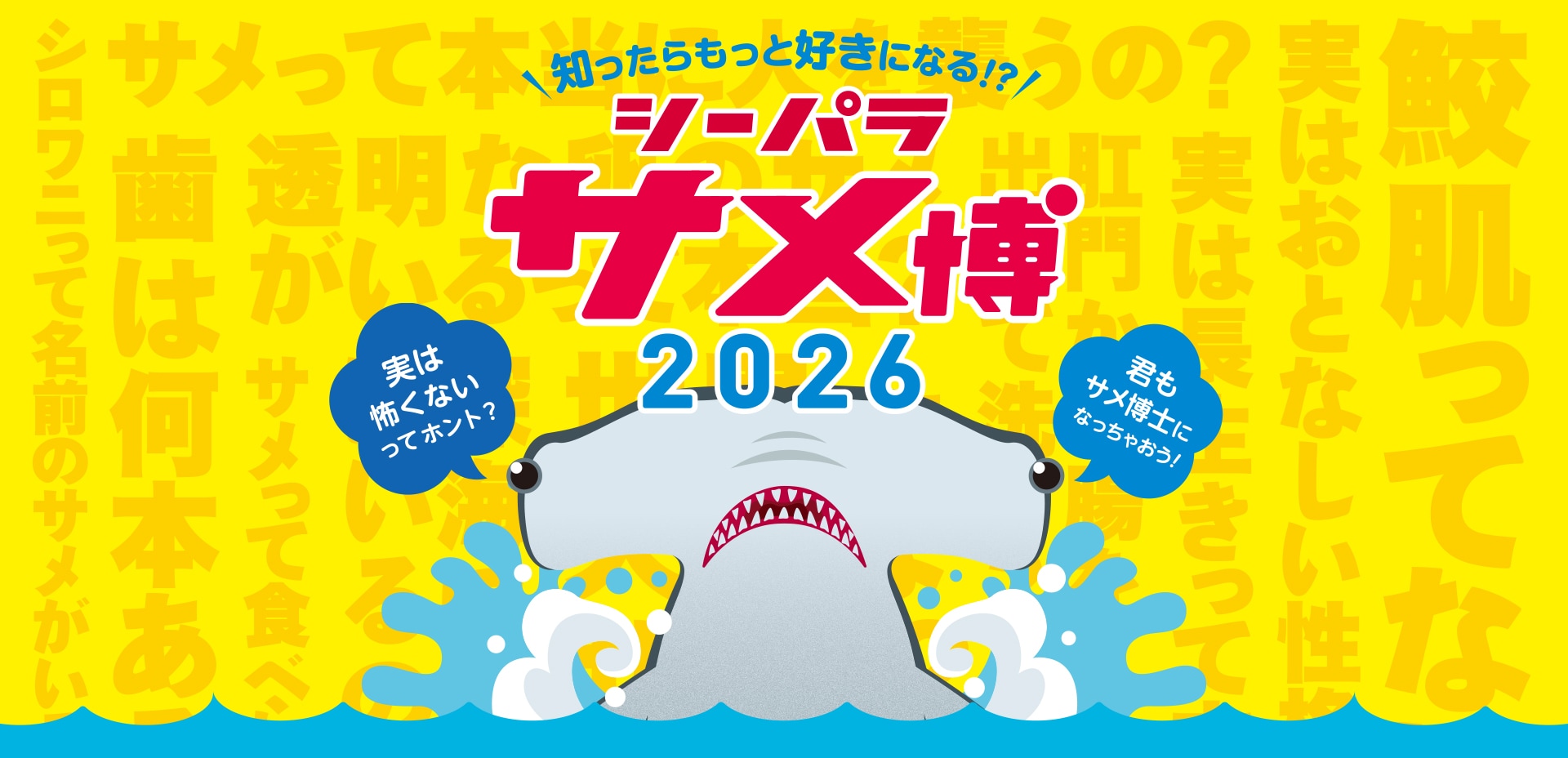【1/9~4/5】期間限定で「ドルフィン ファンタジー」が大変身!?五感で楽しむサメづくしの特別展を開催。館内では頭上を泳ぐサメの展示や100個の豆知識が登場!参加型のプログラムやサメフード&グッズも楽しめます。