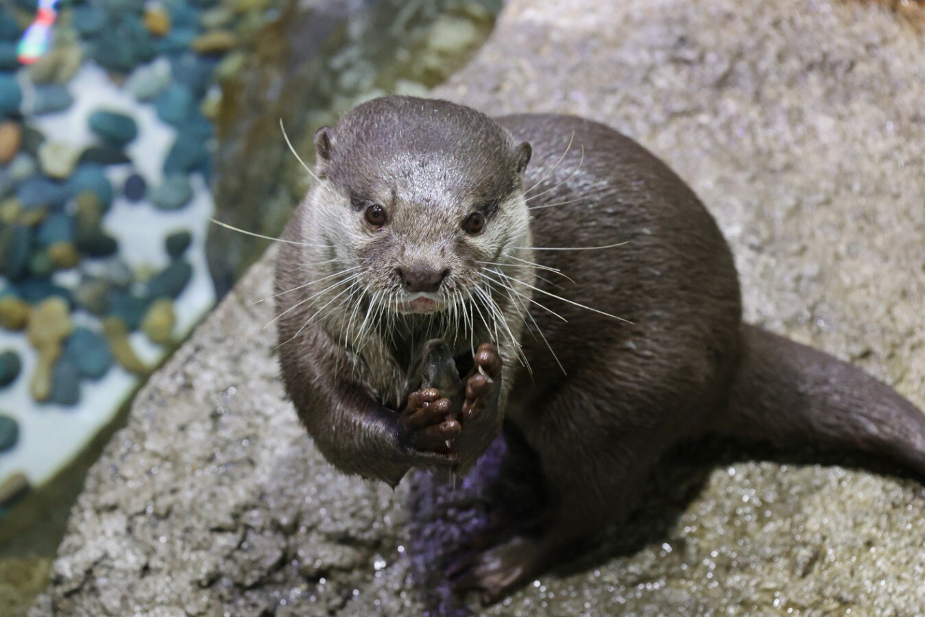 アクアパークの人気者、ごはんを食べることが大好きな雄のコツメカワウソ「たいよう」と、雌の「みつば」が【獺祭(だっさい)】と呼ばれるカワウソの生態を披露!