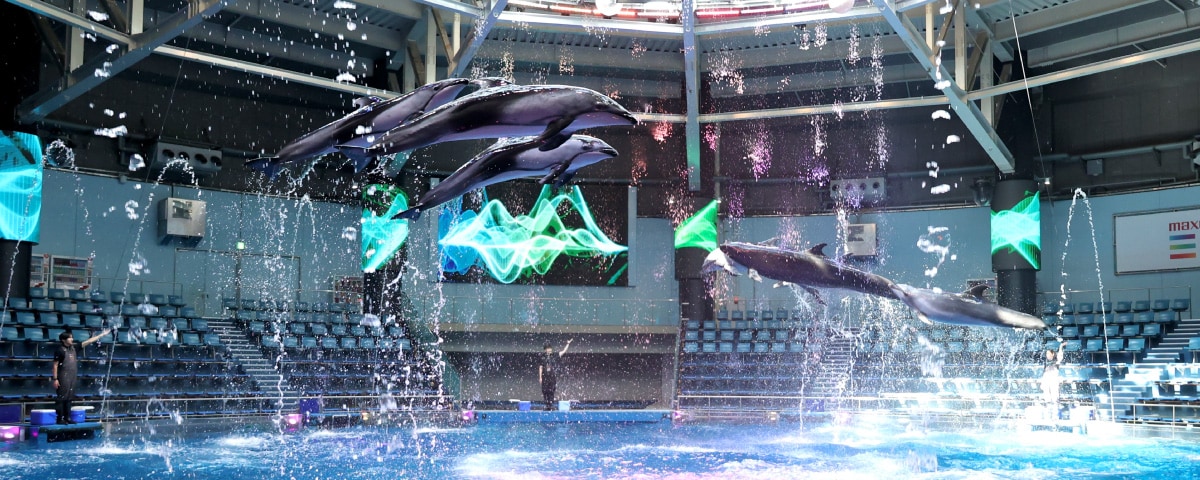 LEDビジョンを導入し、ゾーンまるごとLIVE会場化!ゲスト・イルカ・トレーナーが一体となって作りあげる【参加型】のプログラムをお届けします。イルカたちの圧倒的な身体能力をお楽しみください。